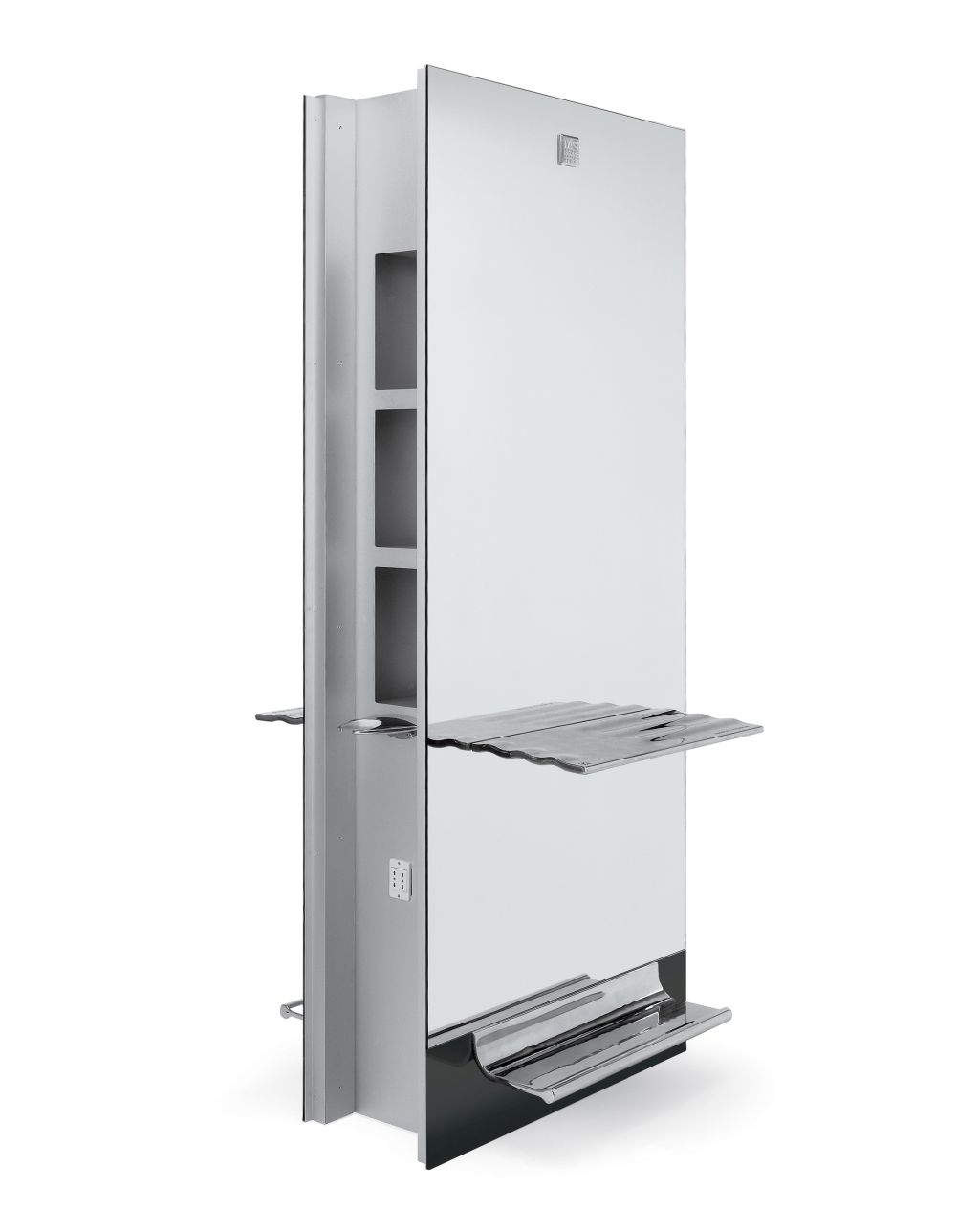 Tocador central diseñado por F. A. Porsche, con estructura en madera para 2 sitios de trabajo. Integra mueble de servicio central con porta-secador. Repisa y apoyapiés de aluminio pulido y tomas de corriente eléctrica. Parte inferior de madera lacada.