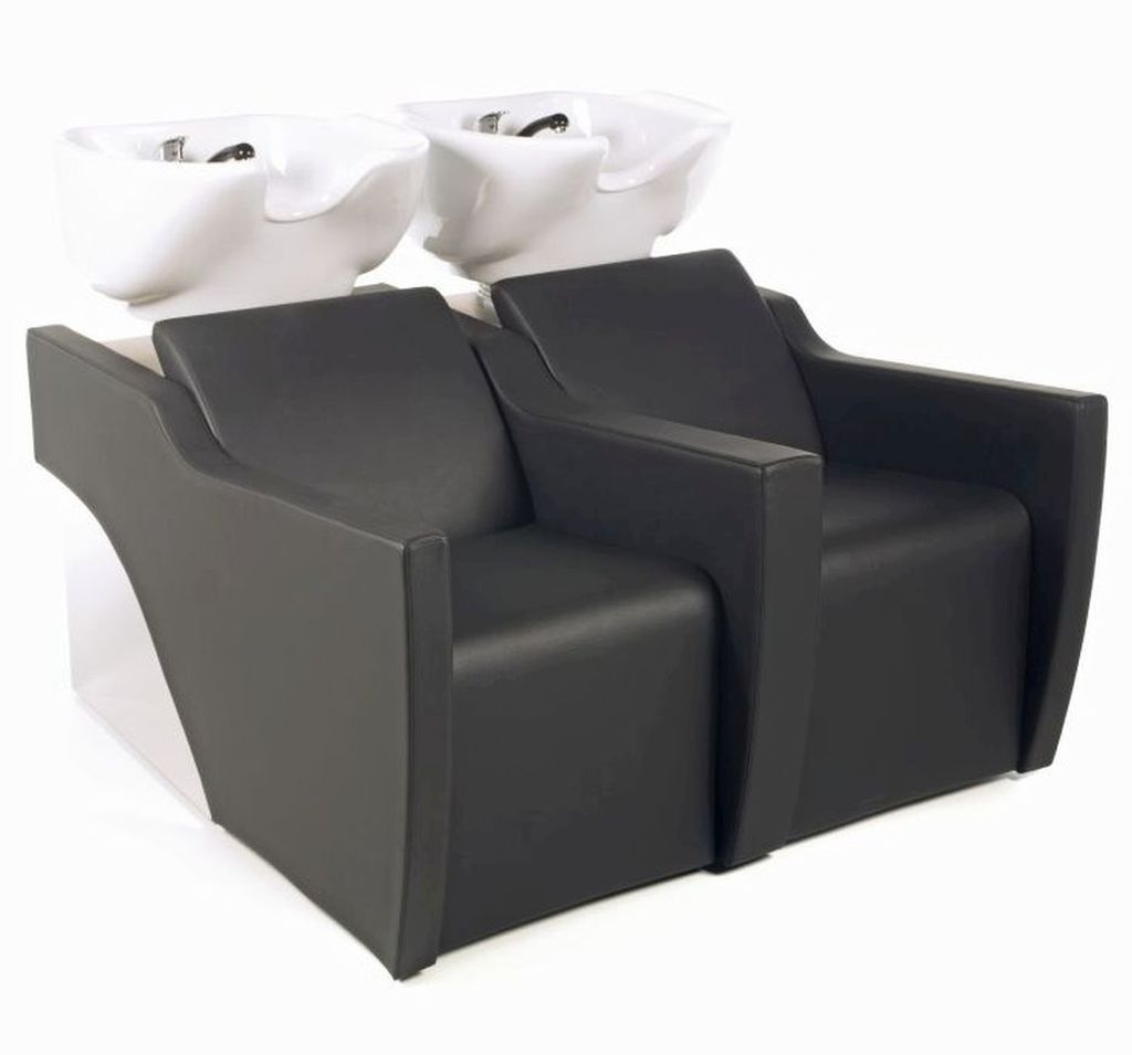 Lavacabezas de relax compacto para ahorrar espacio en el salón, con tejas basculantes y cómodos compartimientos traseros para productos y toallas; acabados de acero inoxidable y tapizado color negro. 2 Puestos. Opcional: Sistema de masaje AIR SHIATSU y reposapiés eléctricos.
