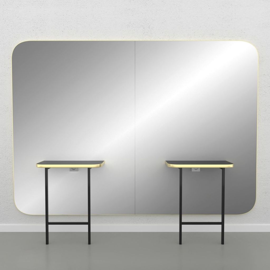 Tocador de pared de 2 plazas, marcos de oro o negro brillante. Estructura metálica negra con encimera negra.