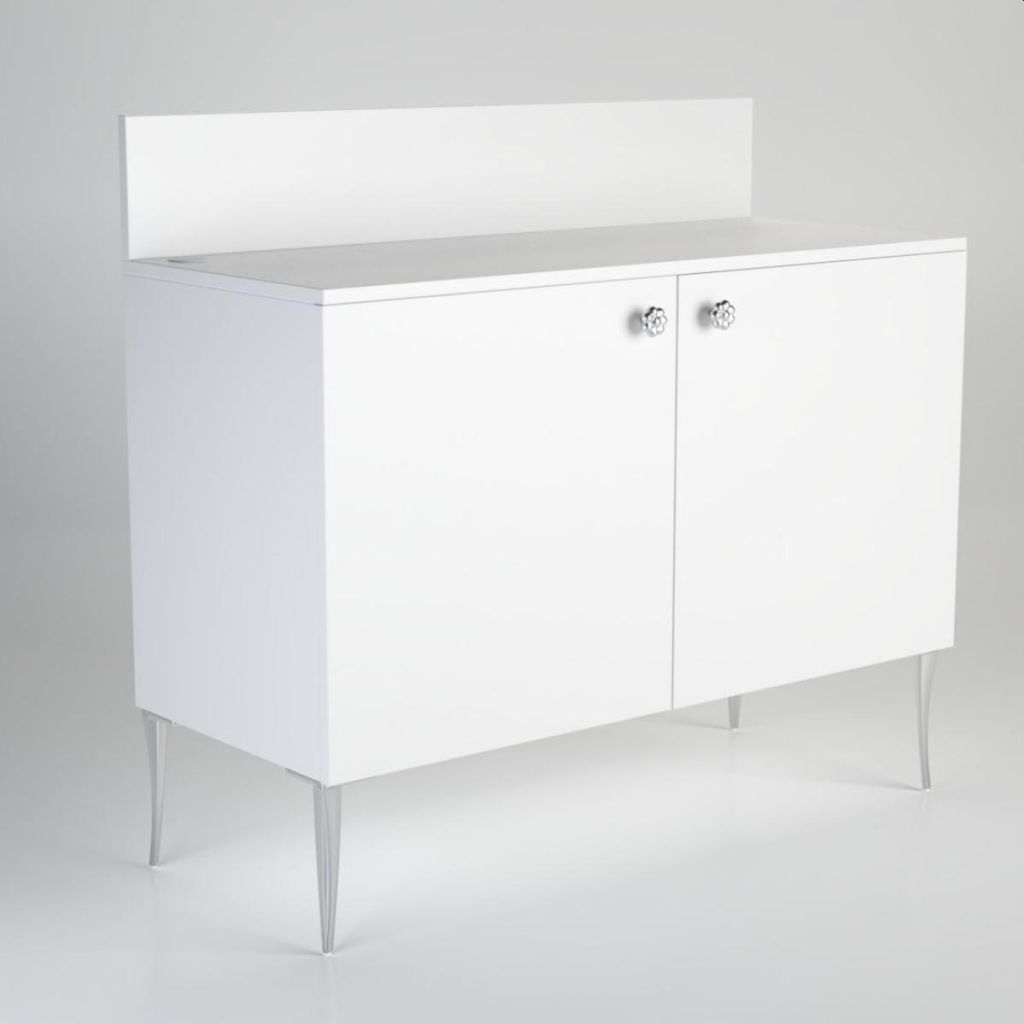 Mueble bar de servicio con compartimientos con 2 puertas. Ideal para ofrecer un ágape a los clientes. Acabados opcionales en melamina (mate) o acrílico (brillo) y en los colores blanco, negro o madera.