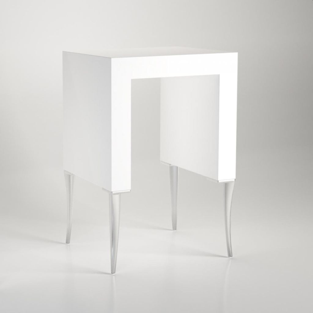 Mueble expositor con alargadas patas de acero. Ideal para escaparates. Acabados opcionales en melamina (mate) o acrílico (brillo) y en los colores blanco, negro o madera.