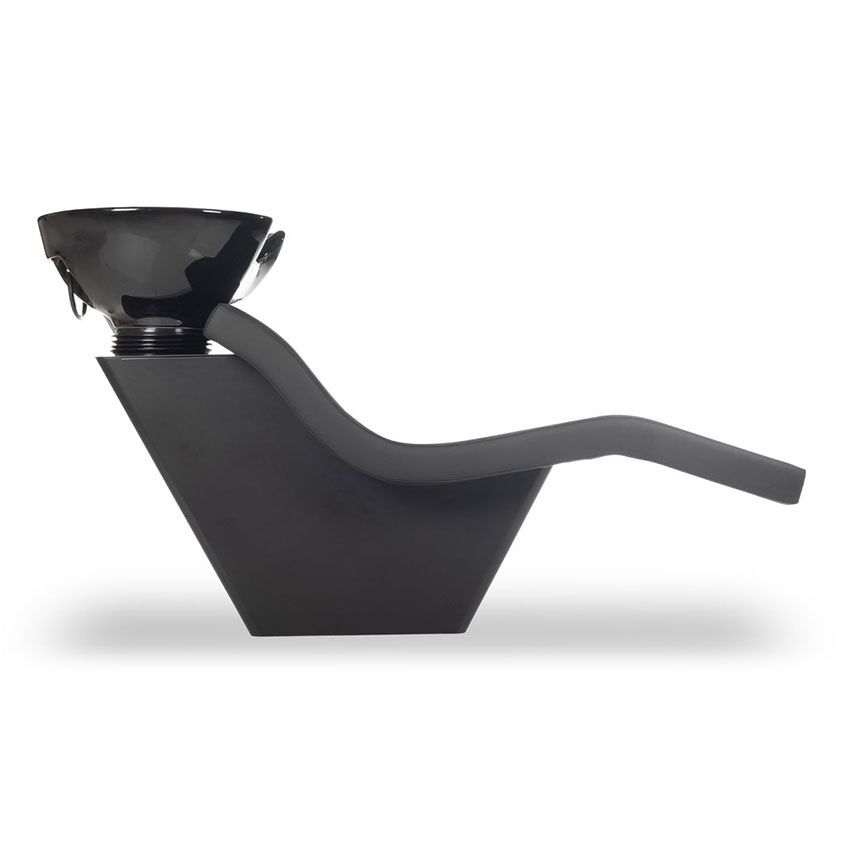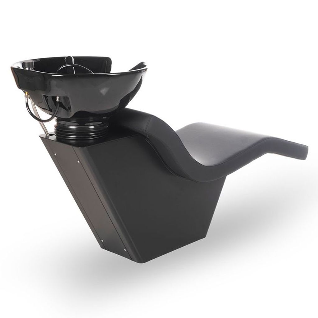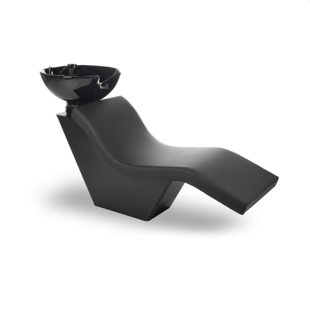 Lavacabezas de relax alargado sin reposabrazos de diseño vanguardista. Tapizado en skai negro, teja de porcelana negra, kit grifo negro y estructura negra. Posibilidad de integrar sistema de masaje Shiatsu completo (espalda, glúteos, piernas).