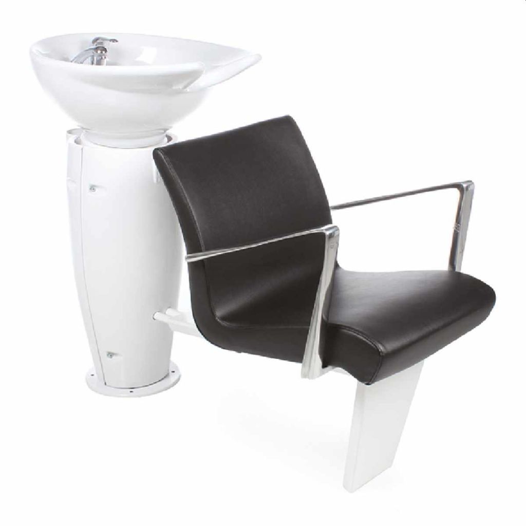 Lavacabezas con teja basculante. Asiento modelo Aluotis. Tapizado negro y opcionalmente en otros colores de la carta. Columna blanca o negra redonda o rectangular gris plata.