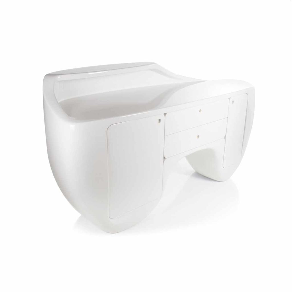 Recepción realizada en fibra de vídrio de color blanco brillo con cajones traseros.