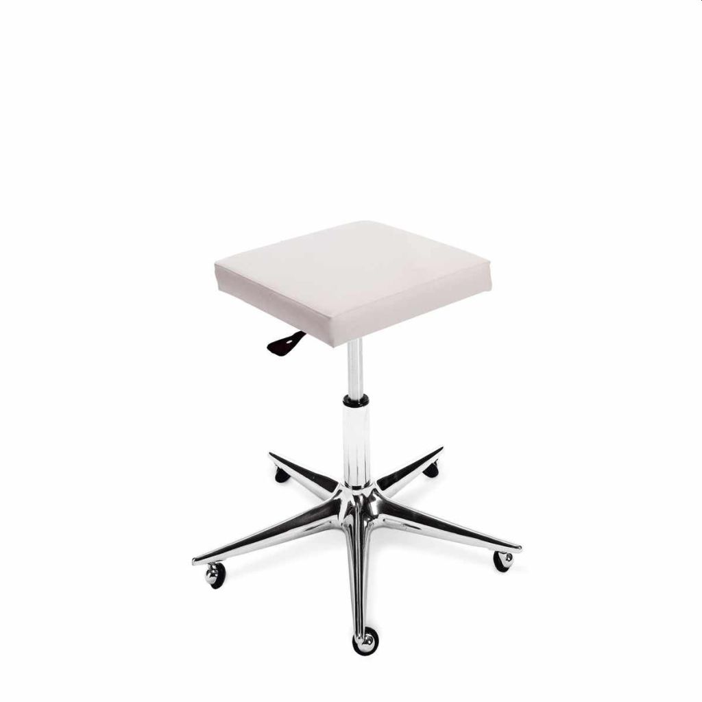 Taburete con ruedas y bomba a gas para ajustar su altura.