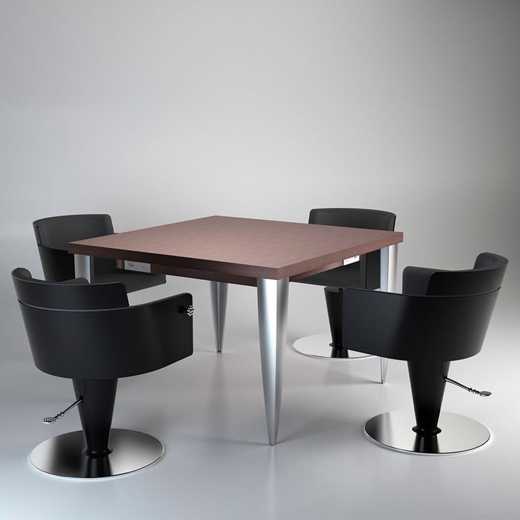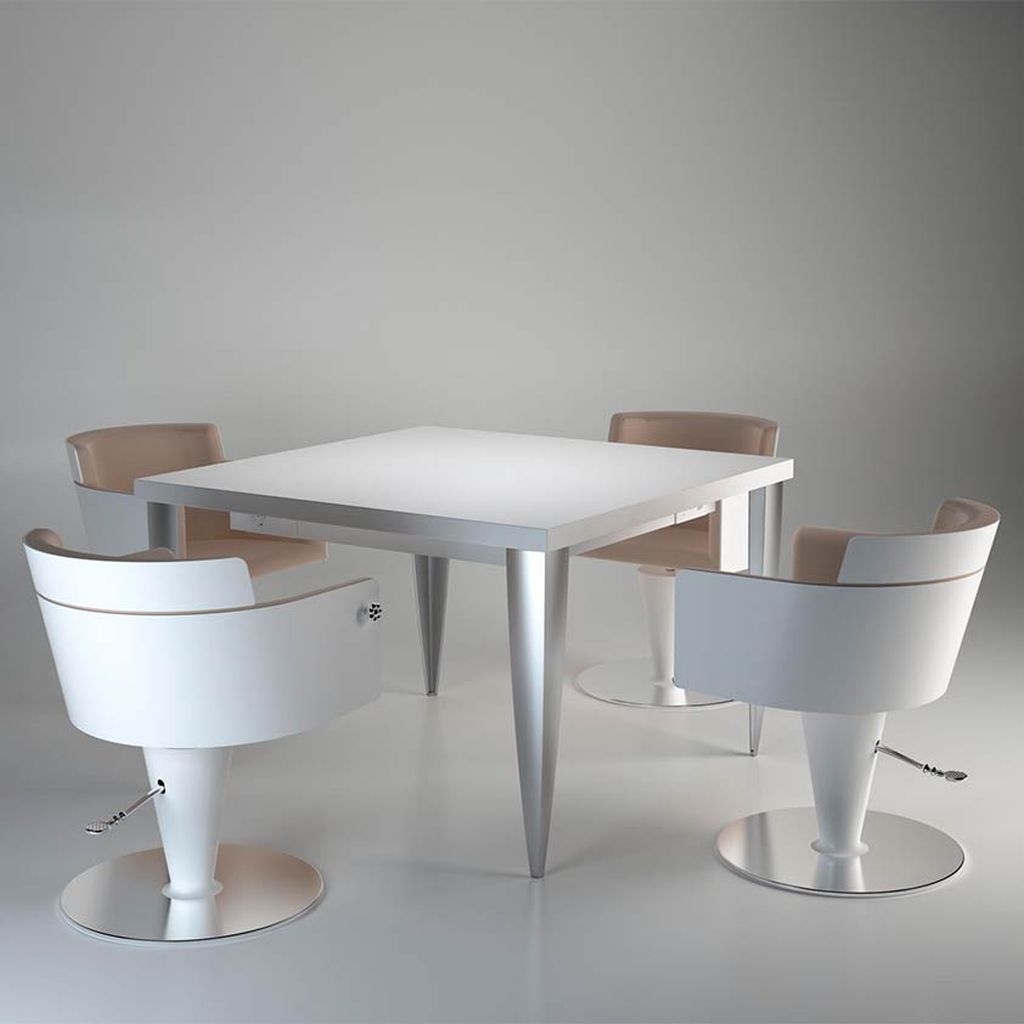 Tocador color bar central. Mesa técnica de trabajo cuadrada con pies de acero para 4 puestos de trabajo. Integra enchufes, tomas USB y pasacables. Personalizable en los colores blanco, negro y wood en mate o acrílico. Forma parte de la Colección Polaris by L'Oreal.