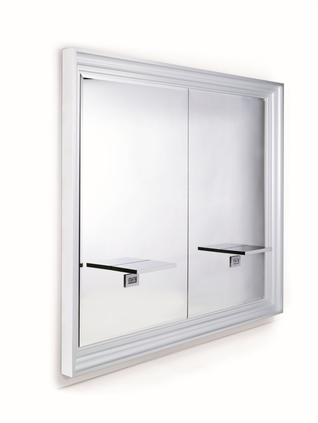 Tocador de pared (mural) con marco de aluminio extruído en color blanco o plata, decorado en el estilo "MARCEL WANDERS". Disponible en diferentes tamaños, 2 sitios de trabajo, tambien a medida. Enchufes eléctricos bajo de la repisa incluidos. Espejo biselado, repisa de acero inoxidable. Disponible en otros colores RAL.